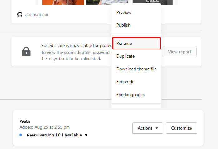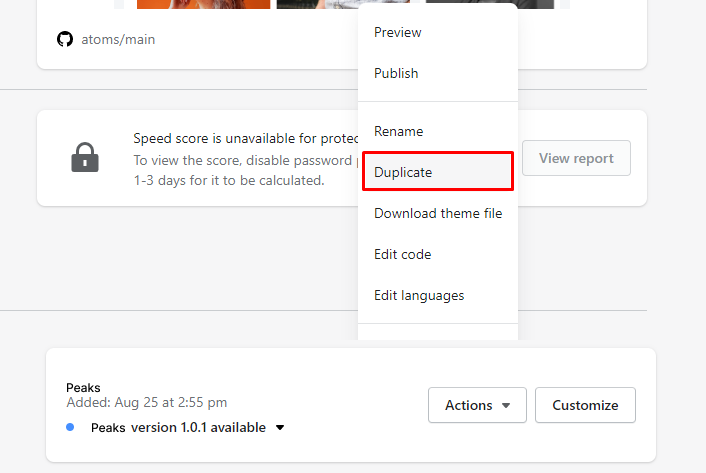 3. In the right window, open up the code editor of the new theme. (**Actions > Edit code)**